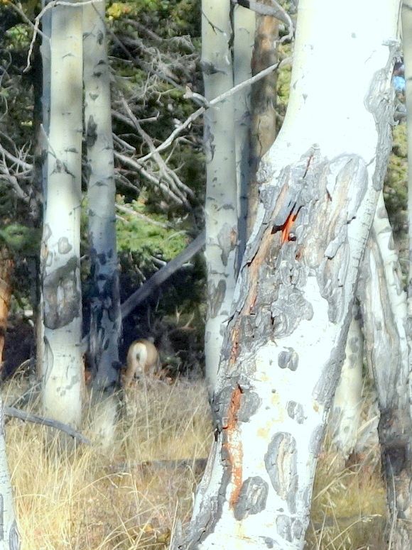 My story? OK, once I recovered from the shock of seeing so many hunters in the field, I realized I was going to have to do some serious walking. Opening morning consisted of altering the direction I was heading no less than three times due to running into multiple hunters. Most were Elk hunters. I did get the glimpse of a good buck traveling through the quakies heading for a north slope drop off. Then a little later in the morning, about 2 1/2-miles in, I encountered a lone buck feeding on the brink of a north slope drop off in a mix of quakies and conifers. He was close and unaware of me. He was big enough to give me a good surge of excitement. Then after further study trough my binocs, I concluded I should let him go. His frame was large with a great spread 3-4" beyond his ears. However, he lacked good mass and had very weak G2-G3 forks. Being the first morning I passed. I didn't fully recognize how difficult the hunting was going to be. Three or four days later I would have surely taken him. Here's the best picture I got of him.