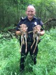Here's couple kids we found the other day, fortunately we found their mother and got them back to her. That's not me in the picture it's one of my officers ( I am better looking ) . A lot of does have already dropped their young in TN.